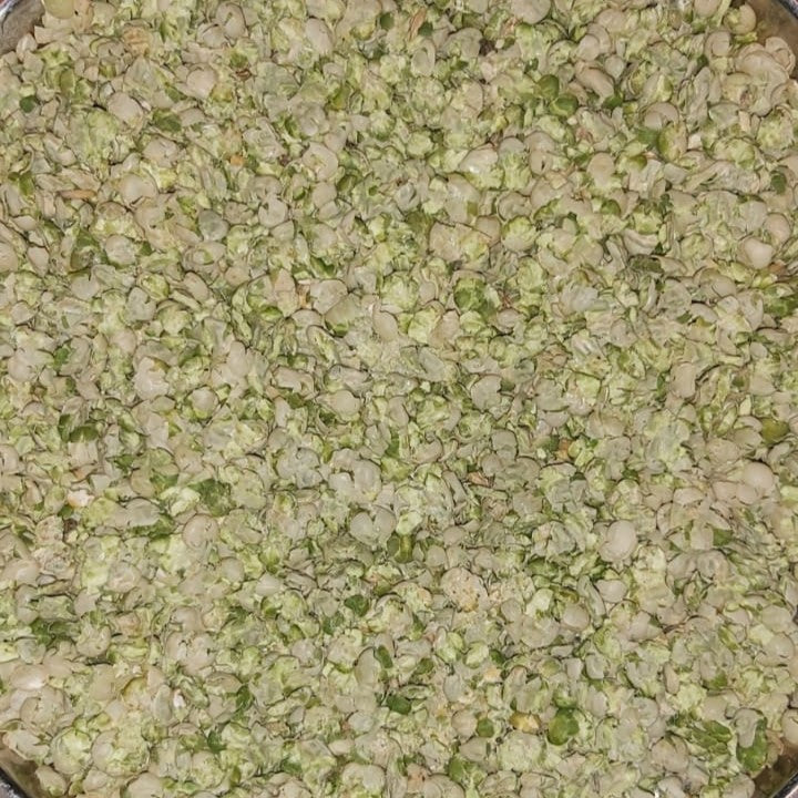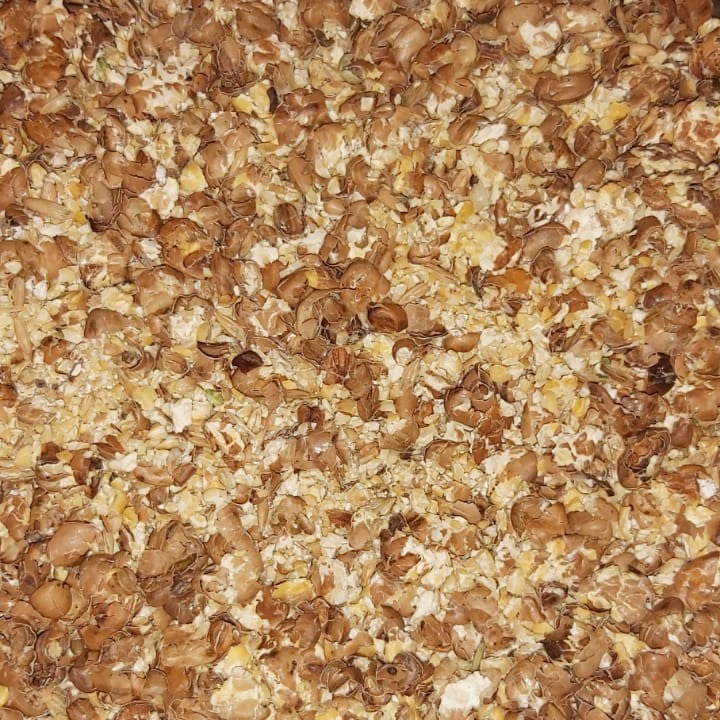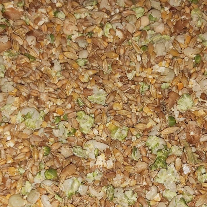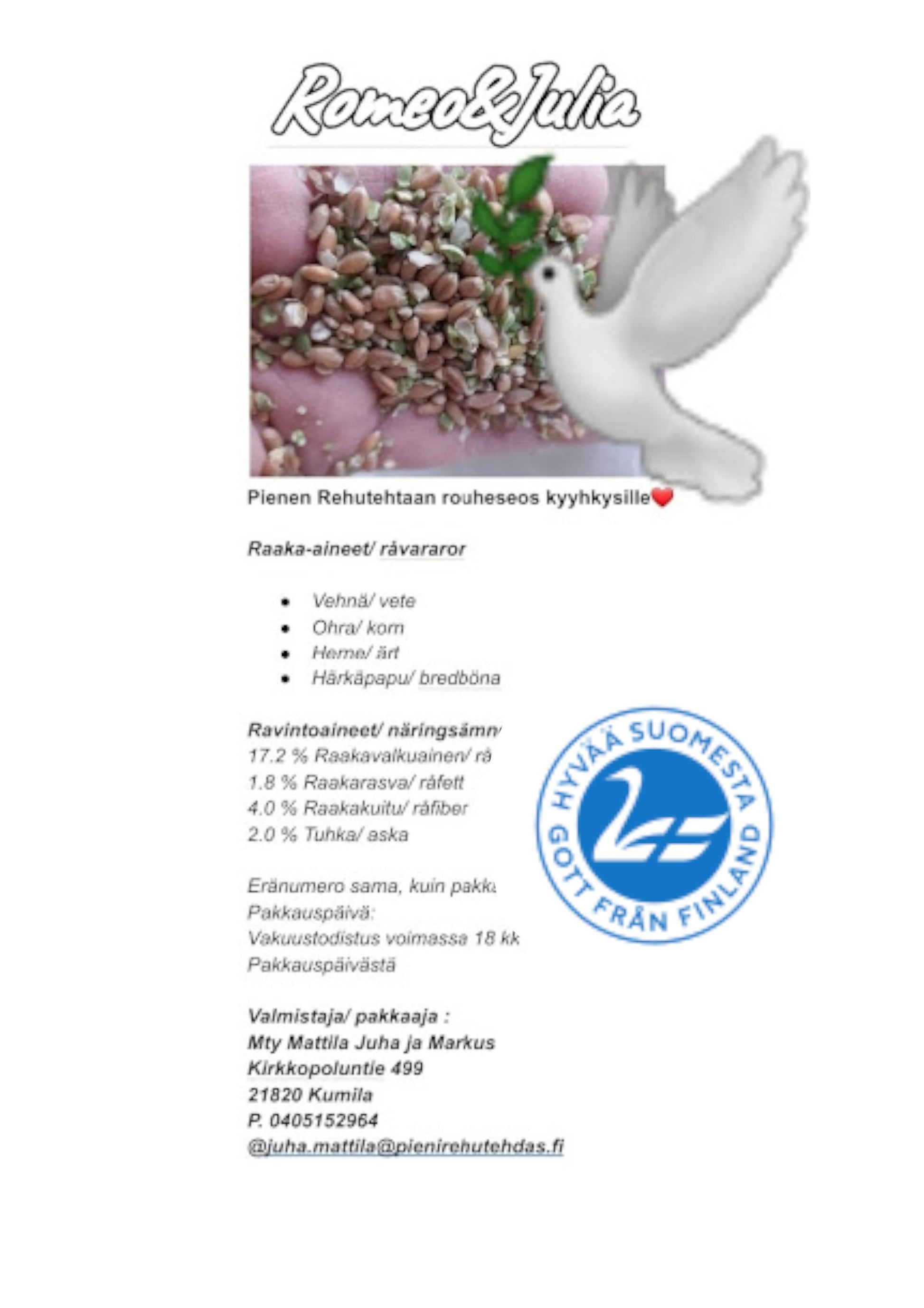 Kyyhkysten rehuseoksessa vehnä ja ohra ovat kokonaisena ja herneet, sekä härkäpapu (matalan haitta-aineiden lajike) ovat rouhittuja.